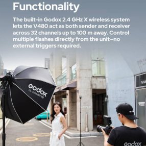 - Sender & Receiver Functionality: The built-in Godox 2.4 GHz X wireless system lets the V480 act as both sender and receiver across 32 channels up to 100 m away. Control multiple flashes directly from the unit—no external triggers required.